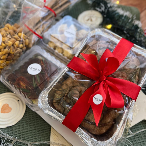Todo presentado en una base de madera, decorado en tonos rojos o verdes.
